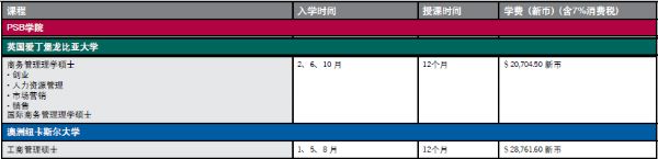 新加坡psb学院研究生课程不多主要是和英国爱丁堡龙比亚大学合办的商务管理理学硕士以及与澳大利亚纽卡尔斯大学合办的MBA课程。