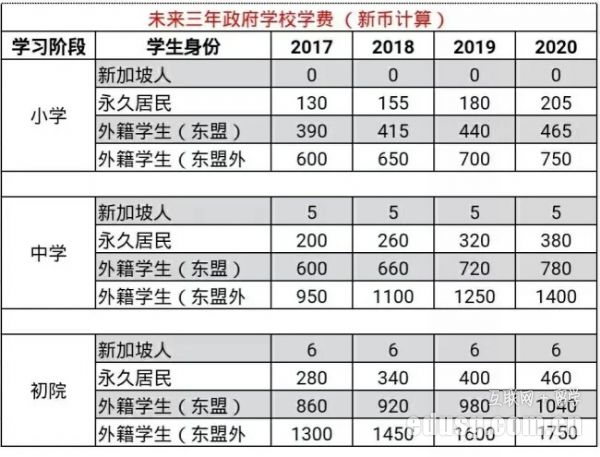 如果是进入初级学院(政府高中),中国籍学生需要支付的学费是1600新币/月,到2020年,每个月的学费将涨到1750新币。