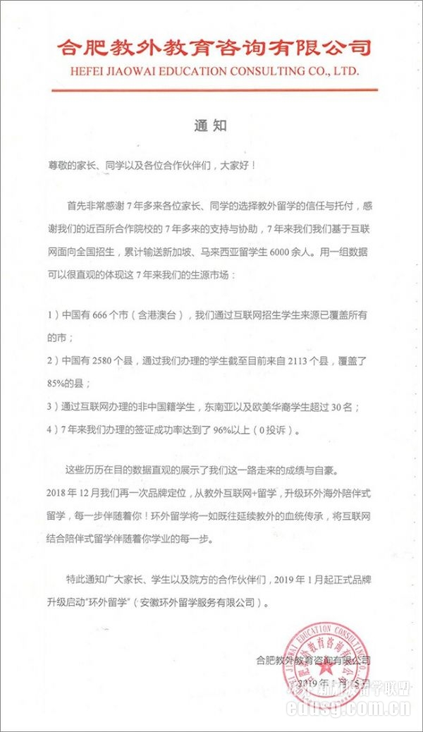 2018年初,金环女士成立合资公司香港环易教育集团,七年的路不长也不短,但我们仍然坚守住专注于新马留学,并于2018年12月再一次品牌重塑,开创陪伴式留学服务体系,创建教外留学兄弟品牌——环外留学,全称安徽环外留学服务有限公司。