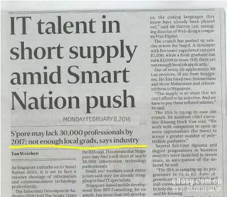 如果大家有时长关注新闻的话,不难发现今年媒体已经多次对IT行业进行了报道和展望:2016年2月8日《海峡时报》,预计到2017年,新加坡将缺少30000名IT行业人才,本地毕业生无法满足这一行业需求。